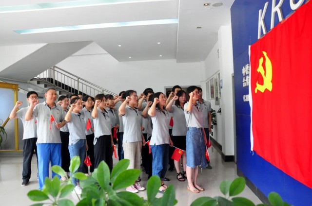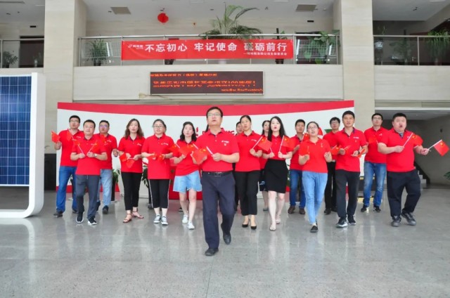 聽(tīng)到熟悉的樂(lè)曲響起,阿特斯光伏電力(洛陽(yáng))有限公司的黨員們從各個(gè)辦公室走出,隨著節(jié)拍舞動(dòng)手中的小國(guó)旗,帶著滿(mǎn)腔的熱忱、昂揚(yáng)的斗志,高聲唱起“他指給了人民解放的道路,他引導(dǎo)中國(guó)走向光明......”