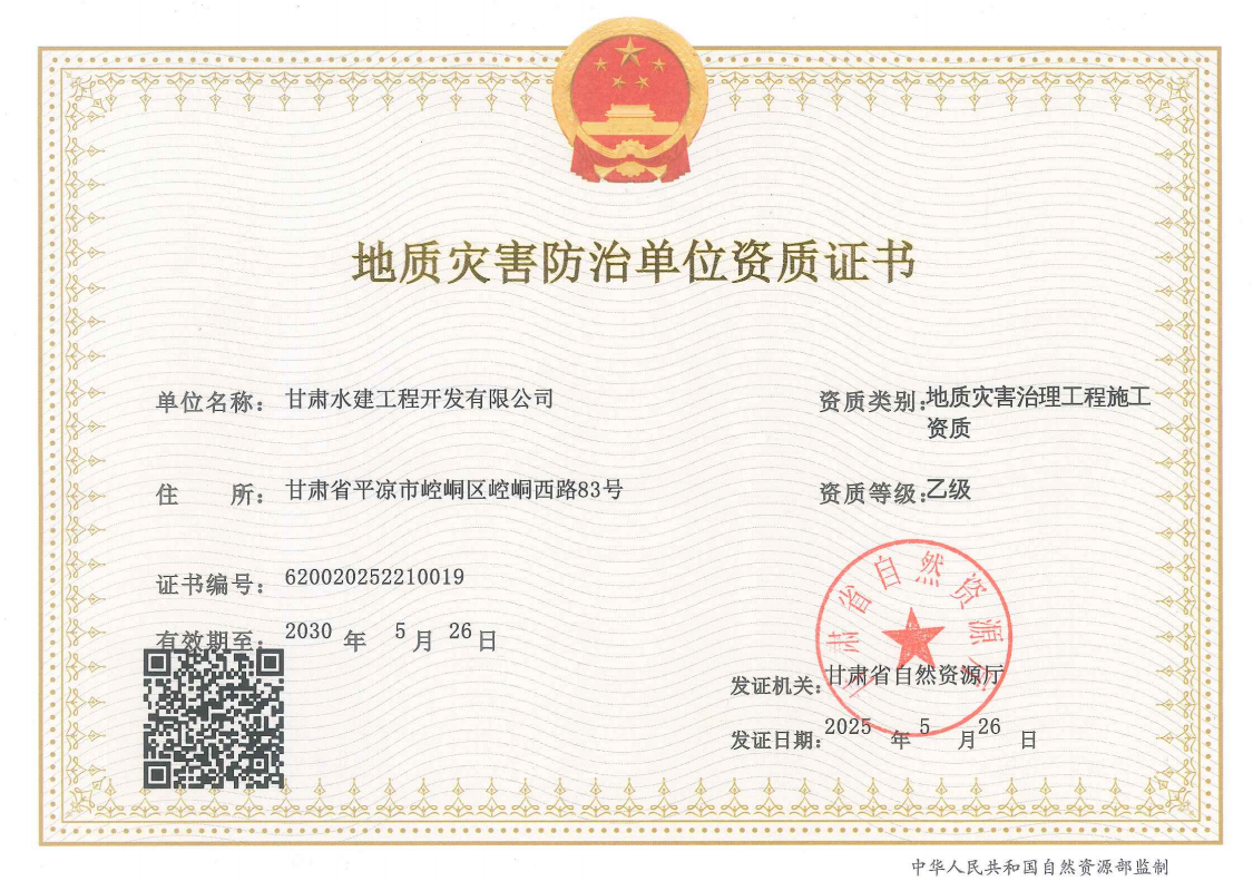 2025-05-28近日,市產投集團水建公司成功獲批地質災害治理工程施工資質!這是繼市政、建筑、勞務等資質后,公司在資質建設領域的又一重大突破,標志著公司向綜合性工程服務領域邁出堅實一步。水建公司始終踐行“誠信立足、服務社會、科學管理、創(chuàng)新致遠”的發(fā)展戰(zhàn)略,近年來,公司